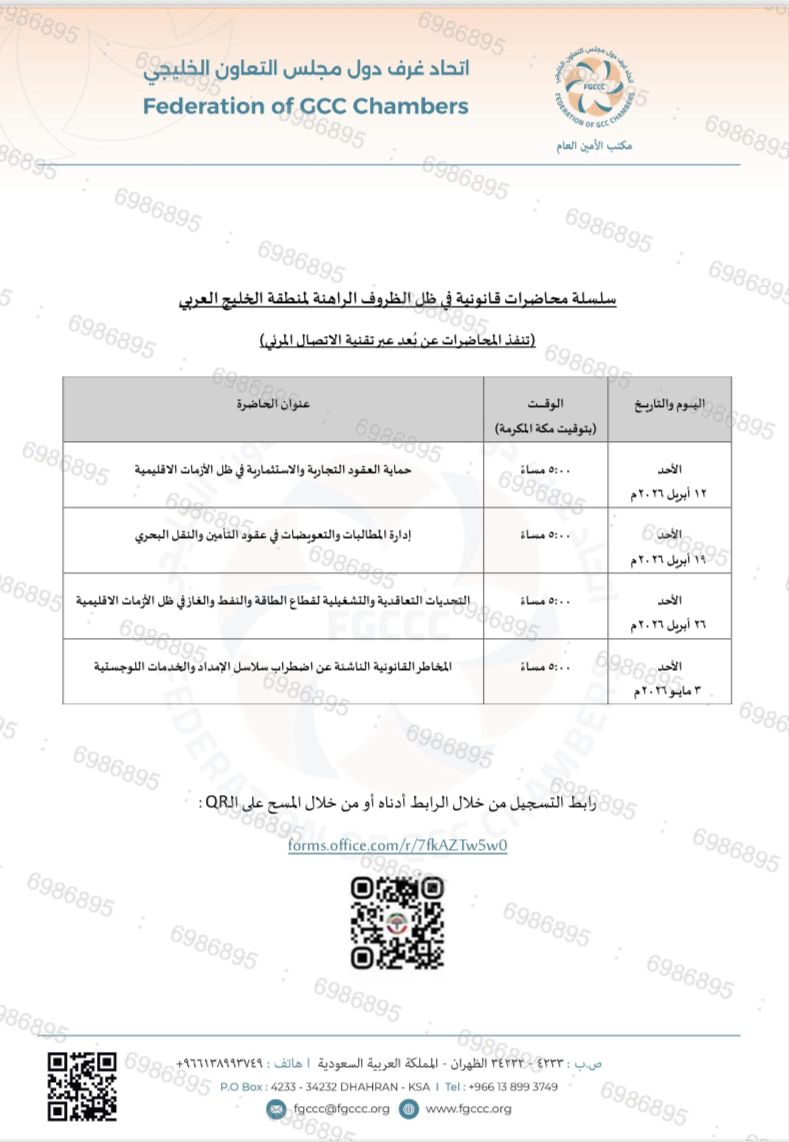 انطلاقًا من دور الاتحاد في دعم بيئة الأعمال وتعزيز الوعي القانوني ومواكبة المستجدات التي تشهدها المنطقة، نود إحاطتكم بأن مركز التحكيم التجاري لدول مجلس التعاون لدول الخليج العربية وبالتنسيق مع اتحاد غرف دول مجلس التعاون الخلجي كشريك استراتيجي، ينظم سلسلة من المحاضرات القانونية تحت عنوان:" في ظل الظروف الراهنة لمنطقة الخليج العربي"، وذلك يوم الأحد من كل أسبوع عبر تقنية الاتصال المرئي